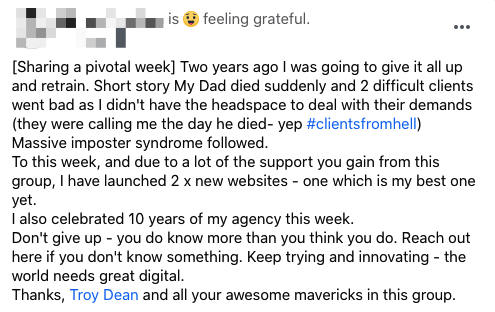When you join groups like this, you'll feel supported, because it's tough doing it alone and you'll find that most digital agency owners feel the same.