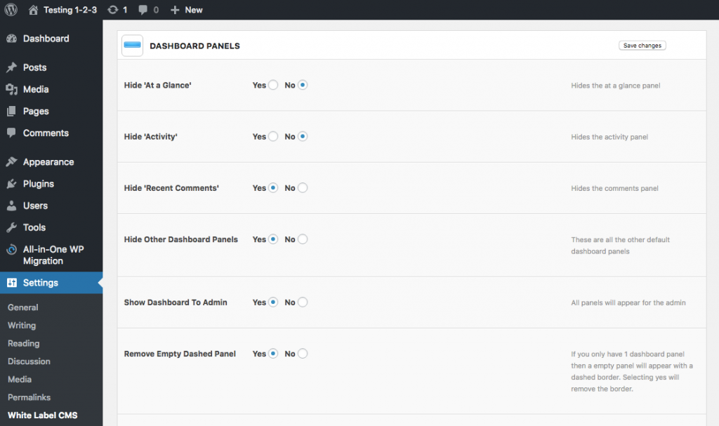 Once that’s done, locate the plugin under the Settings menu. For now, disregard all options except for Dashboard Panels. This is where you’re going to customize the WordPress Dashboard view for the client.
