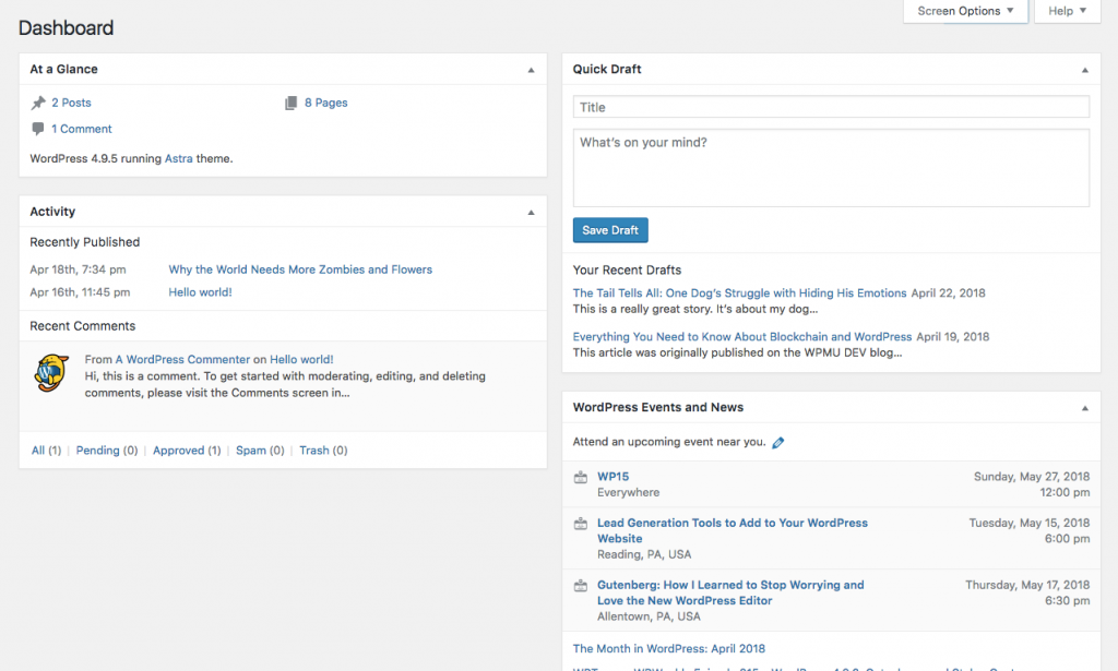 - At a Glance: A running count of pages, posts, and comments.
