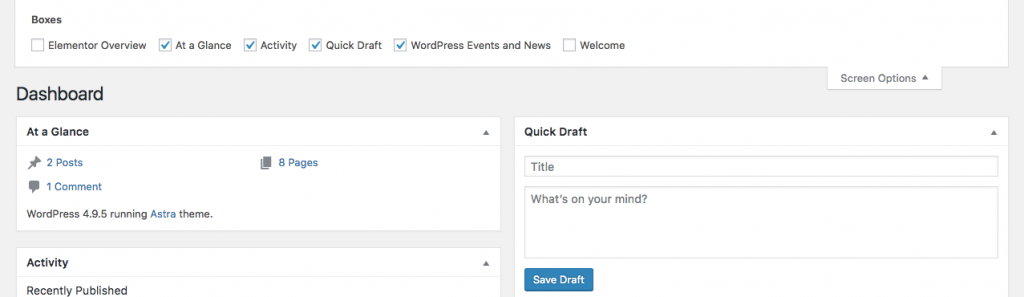 Now, one way to do away with all these and make the dashboard more user-friendly is to remove these irrelevant panels using the Screen Options tab in the top-right corner.