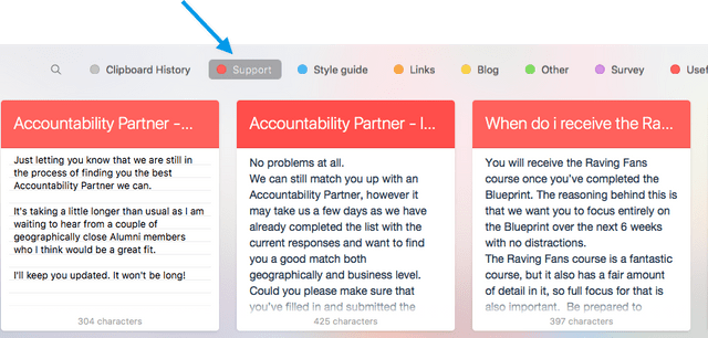 You can also create different pinboards so that, for example, if you have canned responses that you send out on a regular basis, you can create a pinboard of those: